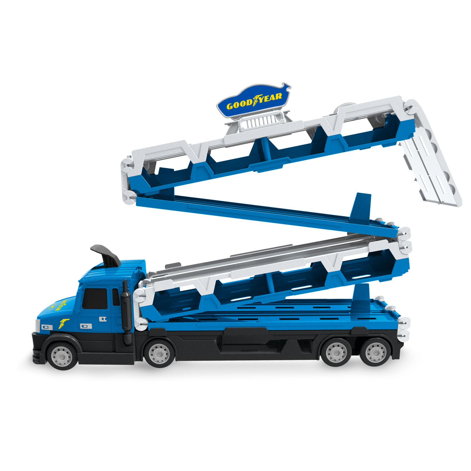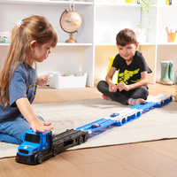 Large transport truck that can be turned into a two lane race track with the push of a button. Including 2 cars. Batteries are included.
