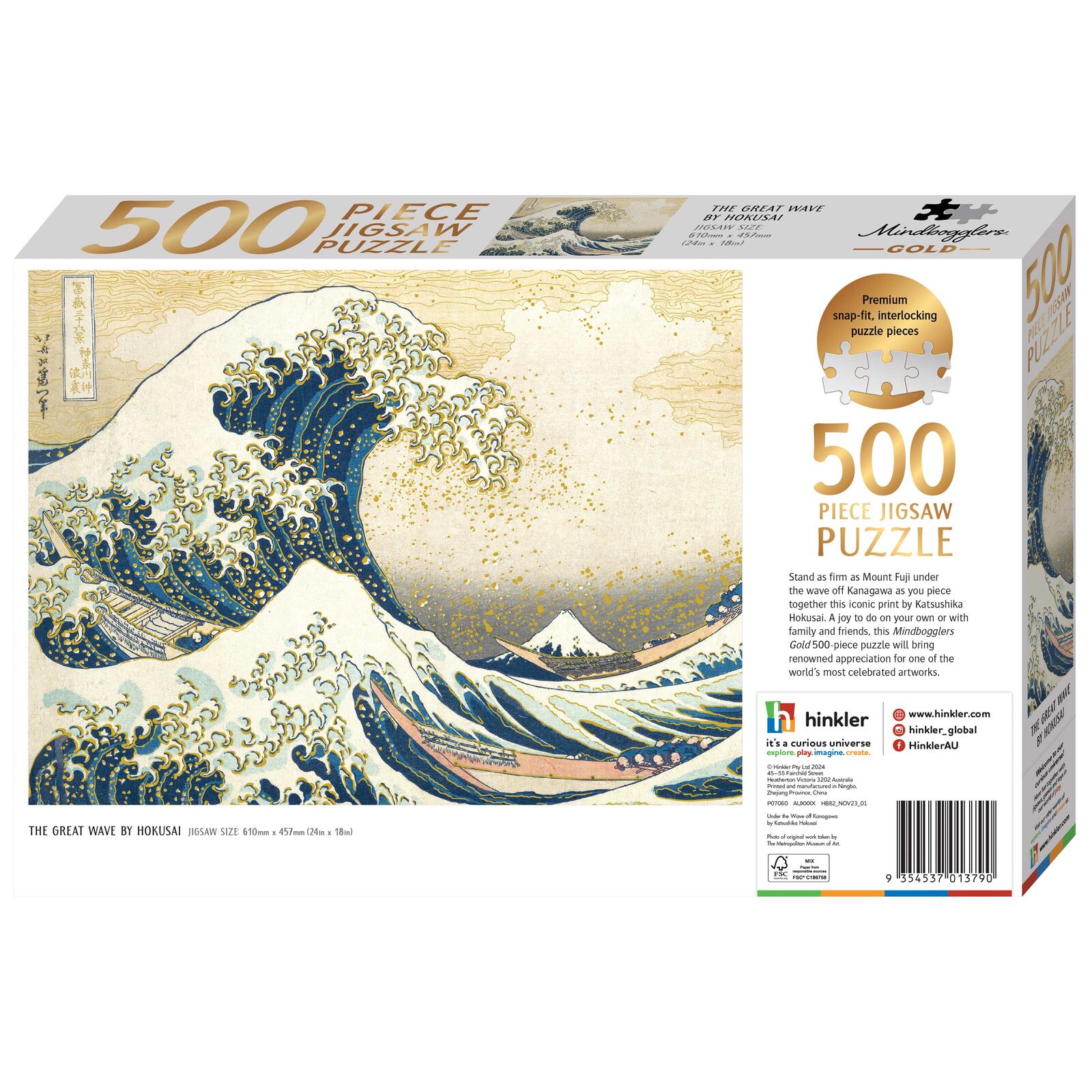 Piece together one of the world's most iconic images. Most famously known as The Great Wave, this timeless print by Katsushika Hokusai has been accented with carefully placed gold foil details, making this a truly stunning jigsaw.