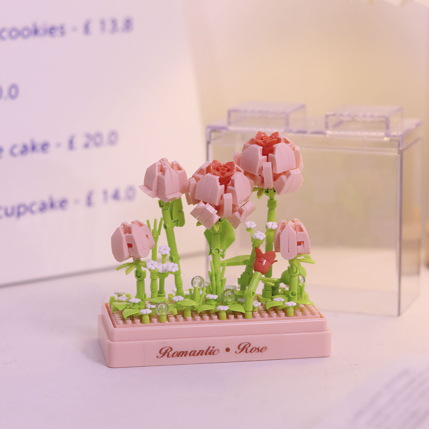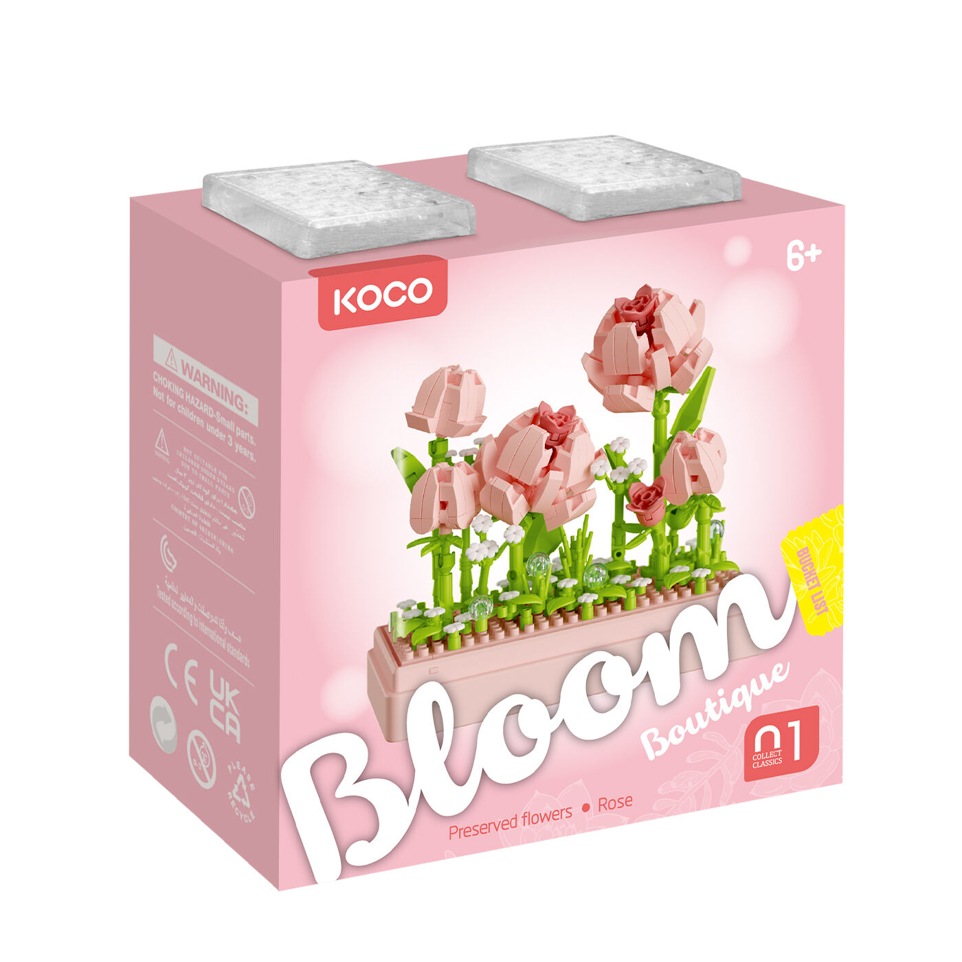 KOCO introduces the Mini Bricks Preserved Fresh Flower - Rose set, comprising 349 pieces. This unique set offers the opportunity to construct a charming miniature arrangement of preserved roses, capturing the beauty and elegance of fresh flowers that will last for an extended period.